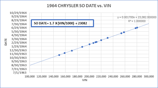 The Body Plate/Fender Tag does not have any of the VIN data directly. There is a remote possibility that the Track Sheet still exists-tucked in behind the rear-seat springs. On our ’64 and other year Track Sheets, the Track Sheet has the last four digits of the VIN and the Schedule Order date. The SO date can be used to determine the first two-three digits of the sequence portion of the VIN fairly accurately. Leading to a complete VIN as all 300’s in a given model year (beginning in 1960) have the same first four digits in their VIN. All 300-G VIN’s start with 8413. I have been collecting matched pairs of SO and VIN for ’64 Chryslers and was able to develop an equation to calculate the SO date from the VIN or vice-versa. Excel produces a number for any given date after 1-1-1900. To calculate the VIN given the SO date from the Body Plate, the equation would be: VIN (just the six digit extension)=588.235*(SO-23082). Example: SO=0101=1/1/64=23,377 (Number of days past 1-1-1900) Thus VIN=588.235(23377-23082)=588.235*295=173529 And the total VIN would be 8413 173529. This may have already been done for model years other than this 1964 example. Since several hundred+ Chryslers might be manufactured on any given day, this method is not precise but it could provide a quick check of whether the VIN and SO date are a reasonable match. Owners of 1964 Chryslers: Please send me a matched pair of the SO date and the last six digits of the VIN of your car. I would especially appreciate receiving data for August-October 1963 and June ’64 SO dates to improve the accuracy and define the range of the equation. The linear relationship might be weak at the ends. 1960-65 aficionados: I’d be glad to send you the Excel spreadsheet I used to develop the VIN/SO relationship for the ‘64’s. Rich Barber Brentwood CA