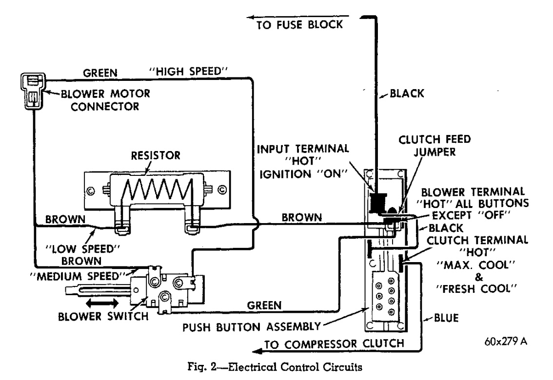 I am wrapping up a long-term dash restoration project and am working through verification of all components. I have a question concerning the "resistor" depicted in Fig. 3 of the Air Conditioning section of the 1962 Service manual -- I've attached a picture. The resistor serves as a means to regulate blower speed - either Low/High - by either pulling/pushing the knob on the temperature control lever. Unfortunately, the resistor is MIA and was likely lost to time. Does anyone know the specs on the resistor and where it would be placed once installed?