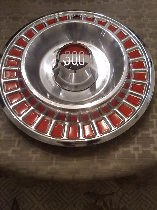 Have for sale a set of two: 300C Hubcaps. Very nice condition. Straight, no curb rash. Center paint has been fully removed and ready for your "correct shade of red" to be applied. The outer squares are nice argent silver. Minor pitting on some of the spinners. One scratch in the paint zone which will not be seen when painted. Overall, a very nice set to mount or have as spares in case one is lost this show season. $150/set. plus the ride to your home.