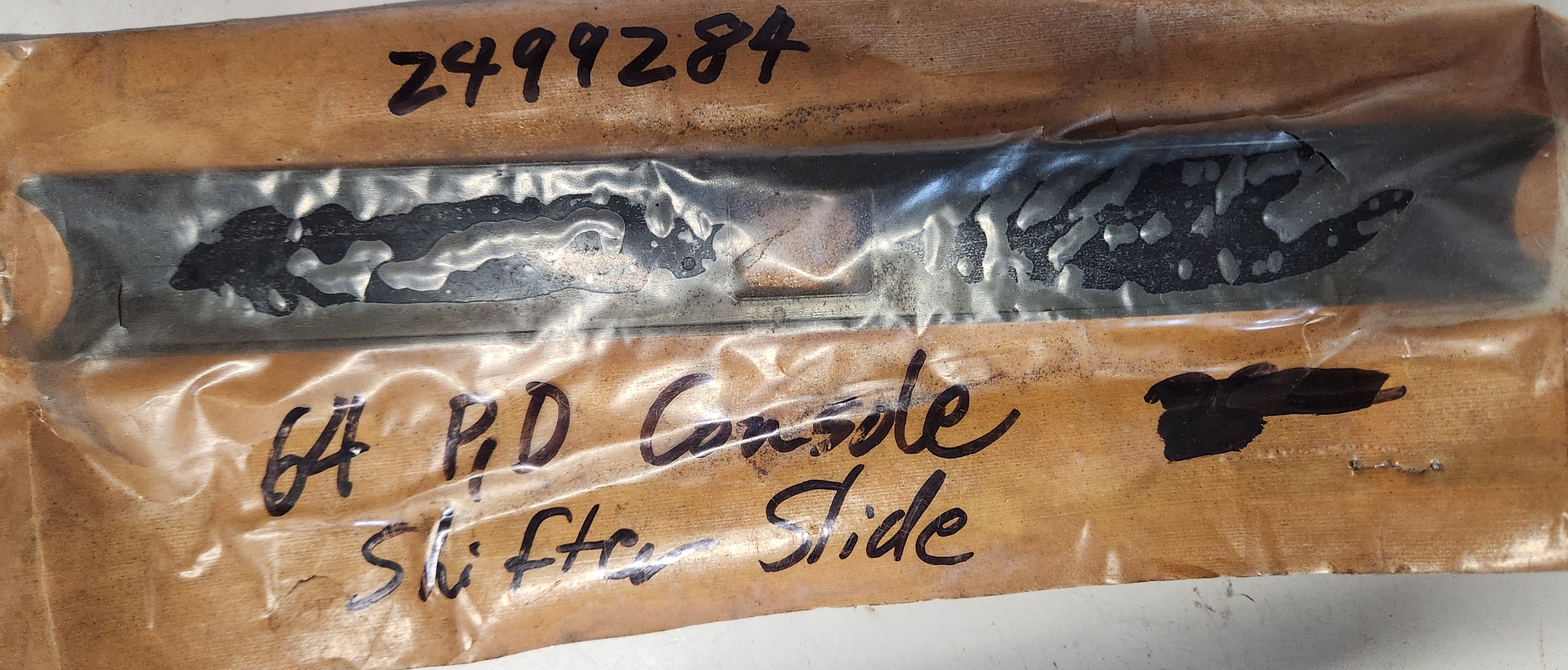 I have NOS part #2499284 shifter slide at $100. The parts book lists this for a b-body, but the console is very similar and it may work in a c-body.