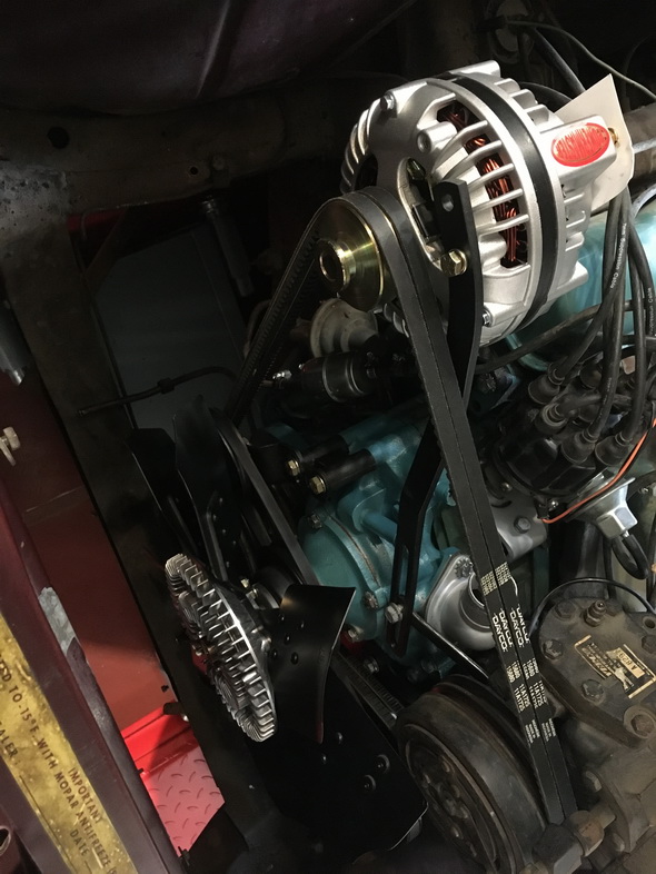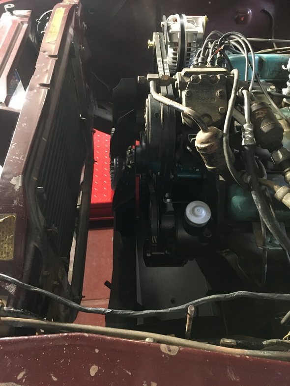 feeling odd. A new unclogged filter may help with that as well. In the engine bay I have the new Powermaster alternator mounted. I have the power steering pump mounted which I cleaned and placed new seals in. The new water pump, clutch and fan. New belts in place, I still need to adjust them. The fan-clutch-pulley bolts are such a PITA, that I am going to slip the new radiator down as I think it is easier than trying to put that fan on with it in place. I tape cardboard to the radiator so the fan cannot bite into a fin if I