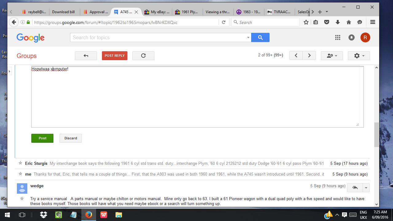 Please address private email -- email of interest to only one person -- directly to that person. That is, email your parts/car transactions and negotiations, as well as other personal messages, only to the intended recipient. Do not just press "reply" and send your email to everyone using the general '62-'65 Clubhouse public email address. This practice will protect your privacy, reduce the total volume of mail and fine-tune the content signal to Mopar topic. Thanks!