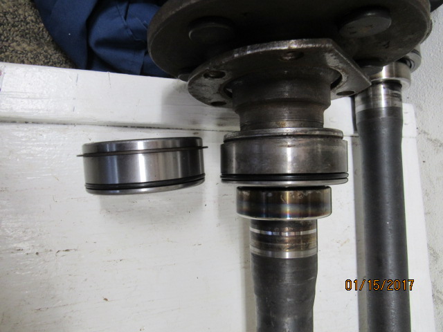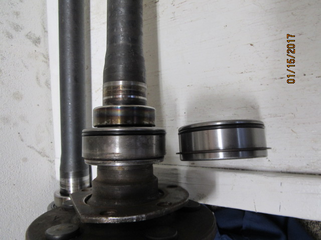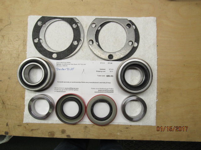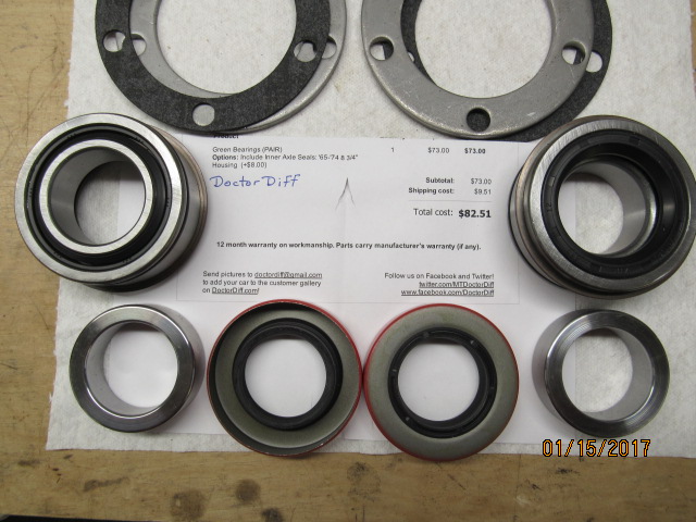 These are the new green bearings I purchased from DoctorDiff.com .... Apparently they added the c-clip, which my 10 year old green bearings did not have, to prevent the lateral motion factor. That clip anchors between the housing and the retainer to prevent motion in either direction. This is what Michael Harding was telling me about the other day. That part number is PAR MO-400 and is the green bearing kit for the 65-74 mopar 8&3/4. They also have one for the DANA 60. My total cost delivered was $82.51. They have gone up from $65 to $73. As you can see the kit includes everything you need.