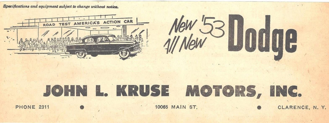 | My 1958 Plymouth Belvedere was shipped to ‘John L. Kruse Motors Inc.’ (dealer no 54883 as noted on my IBM build card) Clarence NY in April of 1958 and sold soon after. The dealership was located at 10885 Main Street and became ‘John K. Kruse Motors Inc.’ upon his father’s (John L.) death in 1962. The Kruse family who had founded the dealership in 1939 kept the dealership until sometime in 1973 when it became ‘Smith Bros.’ Dodge until sometime in 1979 when it became ‘Bob Gibson’ Dodge. ‘Bob Gibson’ Dodge became ‘Clarence Dodge’ until the mid 2009 when it became the used car outlet of ‘Transitowne’ Chrysler, Dodge, Jeep in nearby Williamsville, NY. My guess is the last change to a used car outlet was part of the restructuring of Chrysler’s dealerships in the midst of the 2008-2009 financial crisis in which Chrysler closed nearly 800 dealerships across the US. In the last few years the dealership was sold to ‘Kelly Schultz Antiques’ which operates at 10885 Main Street today.