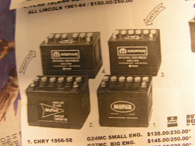I think that George McKovich PM'ed me, to say that the MoPar logo, onMs. Belvie's battery (as depicted on the attached Antique Auto battery folder) was seen to have been placed/oriented toward the fender, instead of its facing inboard, toward the engine compartment. BTW, Style-3 is OEM-correct for Group 24 1957+ cars.The placement of the battery terminals pretty much determines how the battery is to be installed, on the inner fender.Ron Water's pics, from last week, clearly(?) showed that there was no visible logo facing the engine compartment, AND(??) that the battery caps may have been white-colored. I'm wondering what color to re-paint the yellow "Delco" fake-caps which appear on the Tar-Topper-fake-battery-lid, after I remove the "Delco" embossments FROM the fake-caps. Neil Vedder ************************************************************* To unsubscribe or set your subscription options, please go to http://lists.psu.edu/cgi-bin/wa?SUBED1=l-forwardlook&A=1