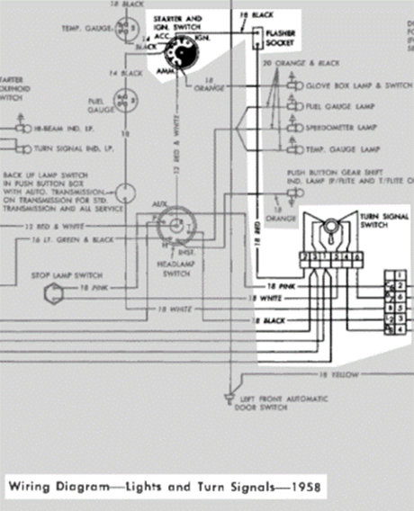 Just to point out, (1) and (2) are not related issues. Here’s a snippet from the 1958 Plymouth wiring diagram where I’ve highlighted the turn signal circuit: